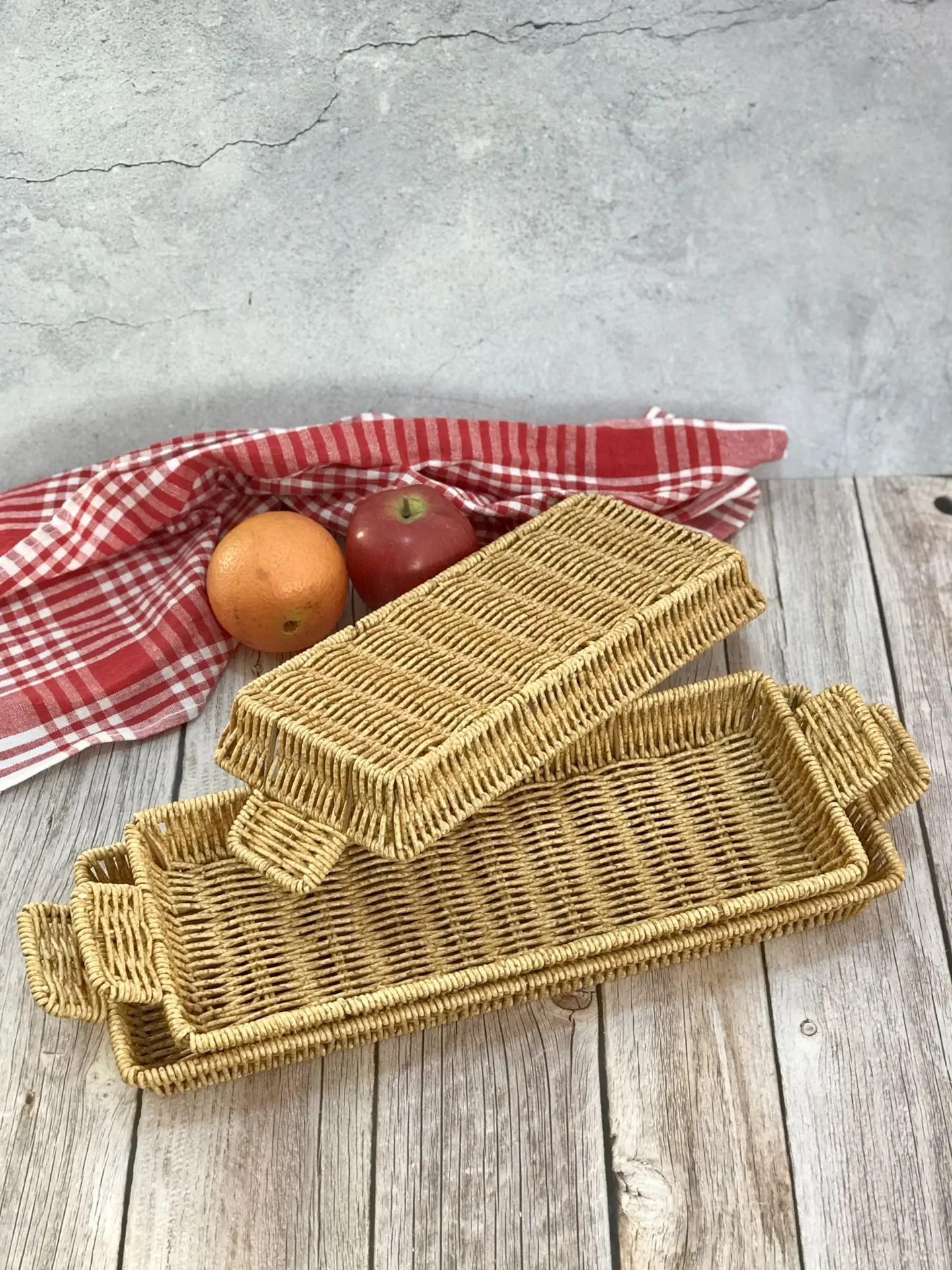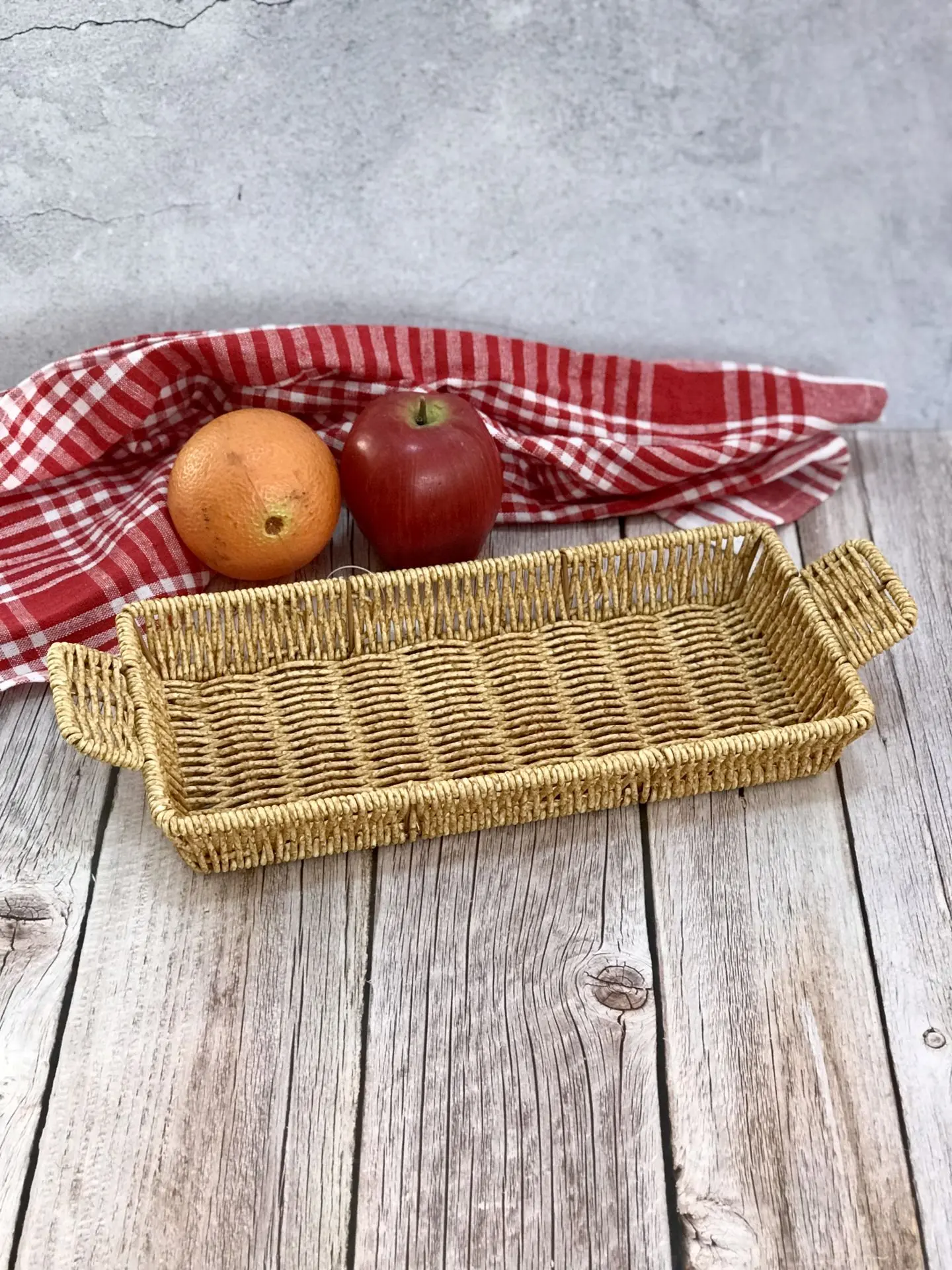 Add a touch of rustic charm to your home with this chic rectangular wicker basket. Perfect for both storage and display, its woven pattern exudes natural beauty, while the handle on one end offers convenience. Whether you use it to organize your kitchen items, hold magazines, or create a decorative centerpiece, this versatile basket enhances any space with its timeless elegance. Ideal for any room in your home, it brings both style and function to your everyday organization.